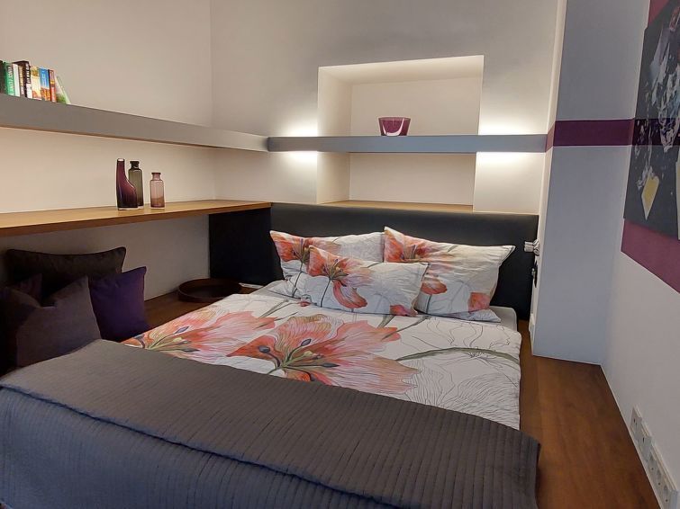 2-Zimmer-Wohnung 70 m2 im 3. Stock. Sehr modern und stilvoll eingerichtet: Eingang. Wohn-/Esszimmer mit 1 Ausziehbett (2 Pers. 2 x 80 cm, Länge 200 cm), Esstisch und Flachbildschirm. 1 Doppelzimmer mit Ventilator. Offene Küche (Backofen, Geschirrspüler, 4 Glaskeramikplatten, Toaster, Wasserkocher, Mikrowelle, Tiefkühler, elektrische Kaffeemaschine, Kapseln für die Kaffeemaschine (Nespresso)) mit kleiner Bar. Dusche/WC. Parkettboden. Zur Verfügung: Waschmaschine, Bügeleisen, Haartrockner. Internet (WLAN, gratis). Bitte beachten: Nichtraucher-Unterkunft. Check In: 16.00 bis 20.00 Uhr (spätere Anreise gegen Kostenersatz möglich) . Check out: bis 10.00 Uhr.