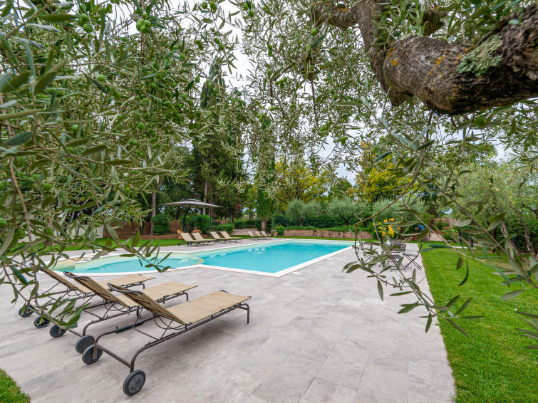 Luxueuze villa "Angeli", gerenoveerd, omgeven door bomen. In het gehucht Sant'Enea, 10 km van het centrum van Perugia, rustige, zonnige ligging, 24 km van het meer, te midden van groen. Voor alleengebruik: terrein 17 ha (omheind), park, mooie tuin ter ontspanning, openluchtzwembad geen inkijk (6 x 14 m, 120 - 140 cm diepte, seizoensgebonden beschikbaarheid: 01.Mei. - 30.Sep.). Onregelmatig zwembad. Douche/WC bij het zwembad, buitendouche, prieel, tuinmeubelen, grill. In het huis: Internet (WiFi), solarium, wasmachine, droger, verwarming alleen beschikbaar van 15.Okt. - 15.Apr. (extra). Wissel van linnengoed 1 maal per week (extra wissel te betalen). Schoonmaak (extra). Kok op verzoek. Ontbijt op aanvraag. Boodschappenpakket mogelijk bij aankomst. Toegangsweg (500 m onverharde weg). Parkeerplaats. Levensmiddelenwinkel 1 km, supermarkt 8 km, restaurant 1 km, meer (zwemmen) "Trasimeno" 24 km. Golfterrein (18 holes) 13 km, tennis 10 km, manege 10 km. Attracties in de buurt: Panicale 27 km, Bevagna 30 km, Todi 33 km, Passignano sul Trasimeno 35 km, Assisi 35 km, Città Della Pieve 37 km. Groepen jongeren uitsluitend op aanvraag. Geschikt voor evenementen. Luxe villa uit de 18e eeuw gelegen in een mooi park met veel uitzichten op de omringende heuvels vol met olijfbomen. De villa heeft een eigen kapelletje, een poolhouse met een keukentje en er is een mooie plek om buiten te eten.