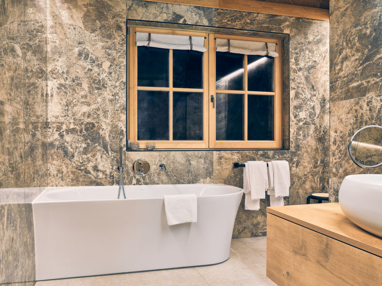 "Sissis green Chalets", chalet 16-kamers. Luxueus en met veel hout ingericht: hal. 4 2-pers. kamers, elke kamer heeft douche/WC, TV en Digitale TV (Flatscreen TV). Groot woonkeuken (afwasmachine, 4 inductiekookplaten, broodrooster, waterkoker, magnetron, elektrische koffiemachine, kookeiland) met eettafel, open haard, TV en Digitale TV (Flatscreen TV), elektrische rolluiken. Uitgang naar het terras. Bovenverdieping: 8 2-pers. kamers, elke kamer heeft bad/douche/WC, TV en Digitale TV (Flatscreen TV). Uitgang naar het balkon. 4 groot terrassen 25 m2. Terrasmeubelen, barbecue, ligstoelen. Mooi uitzicht op de bergen. Ter beschikking: wasmachine, sauna, haardroger. Internet (WiFi, gratis). Parkeerplaats. Rookvrij huis.